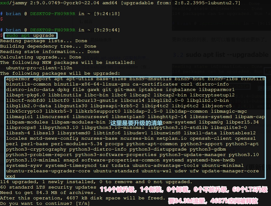 用sudo apt update只有哪些软件包需要更新后,就可以执行sudo apt upgrade来全部更新。