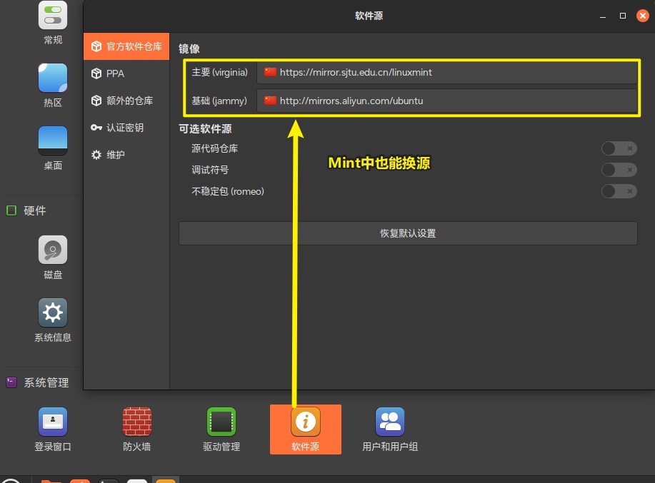 (8)Unbuntu同系列的发行版LinuxMint的内置桌面配置也能进行换源